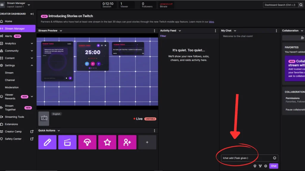 6. Enter the commands into your Twitch chat or chatbot panel.