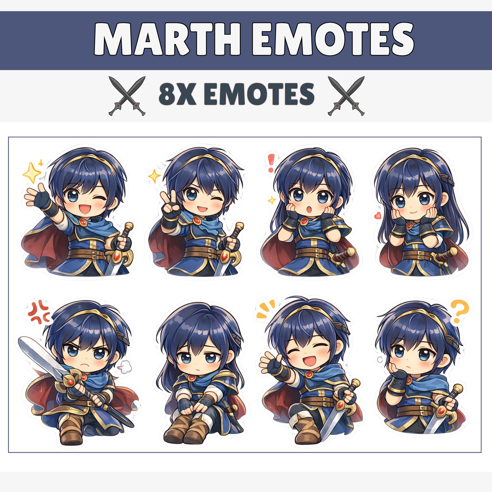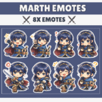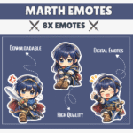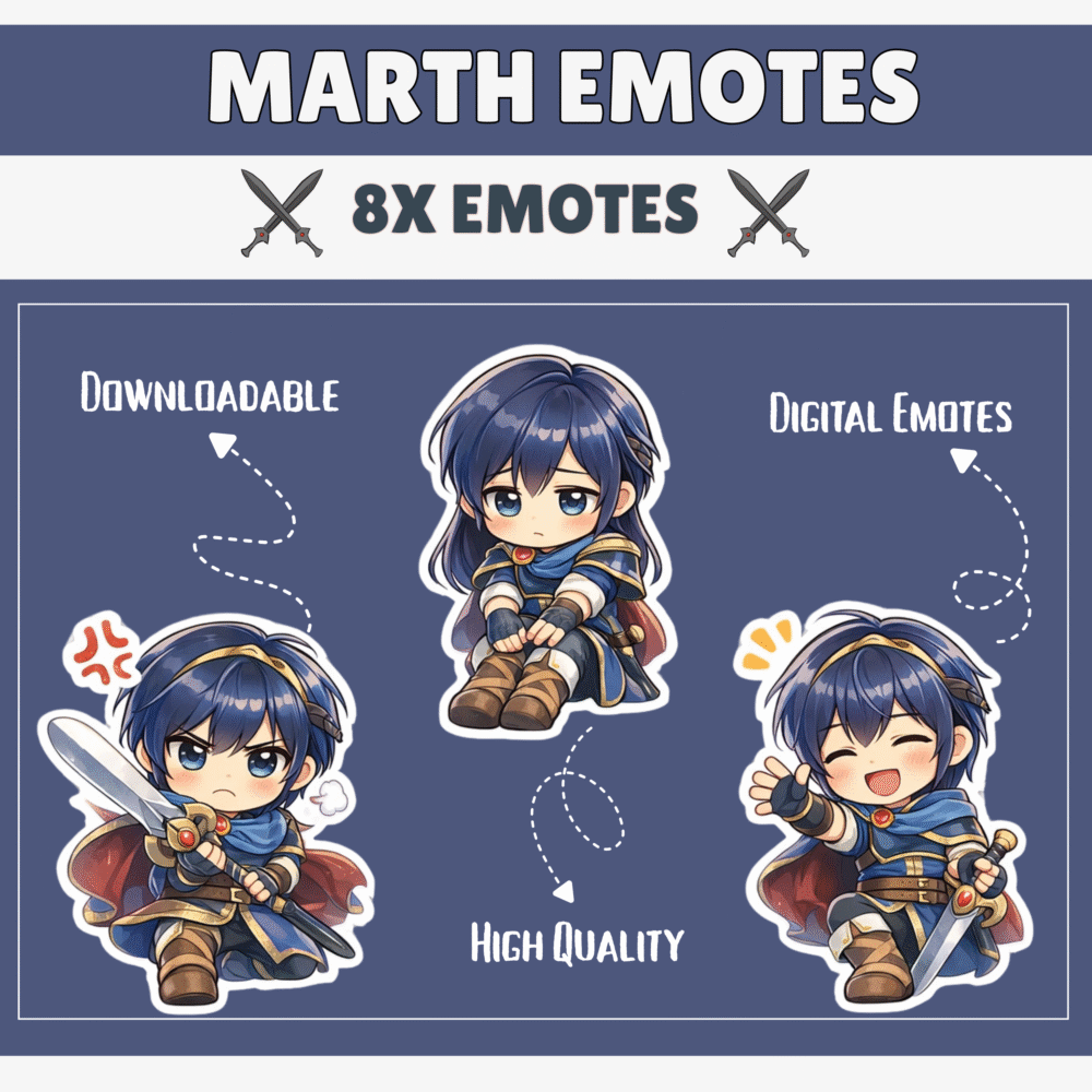Marth Emotes use clean lines, sharp details, and vibrant colors. As a result, every emote looks clear on Twitch, YouTube, Kick, and Discord. Additionally, the designs scale perfectly across all sizes. Therefore, your emotes remain sharp whether viewers use them in small chat bubbles or large overlays.