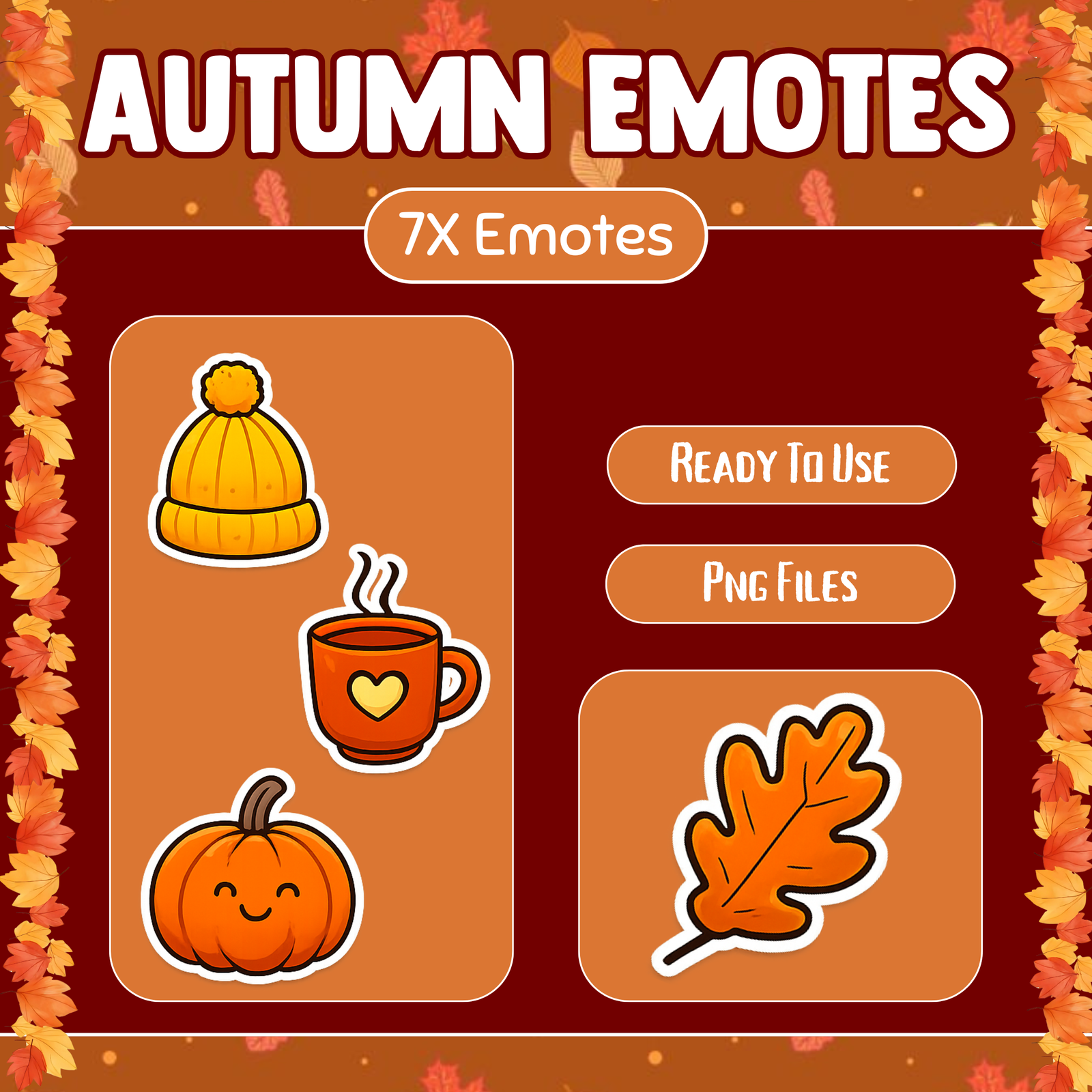 Autumn Style Emotes work perfectly on Twitch, YouTube, and Kick. Moreover, these emotes follow platform size requirements. Therefore, you can upload them easily without extra editing.