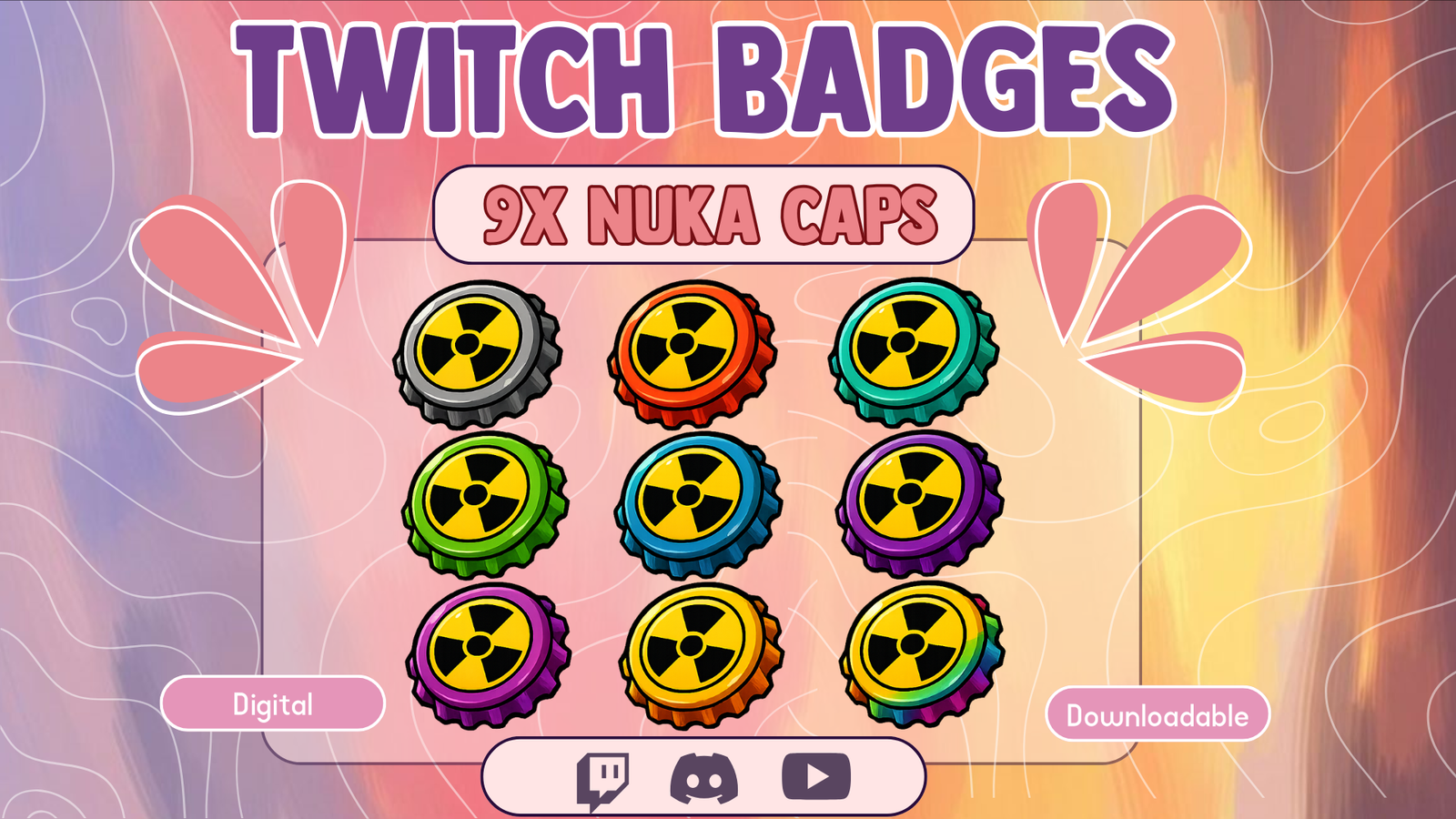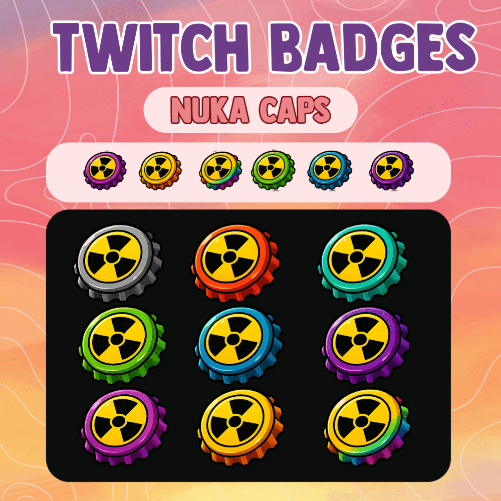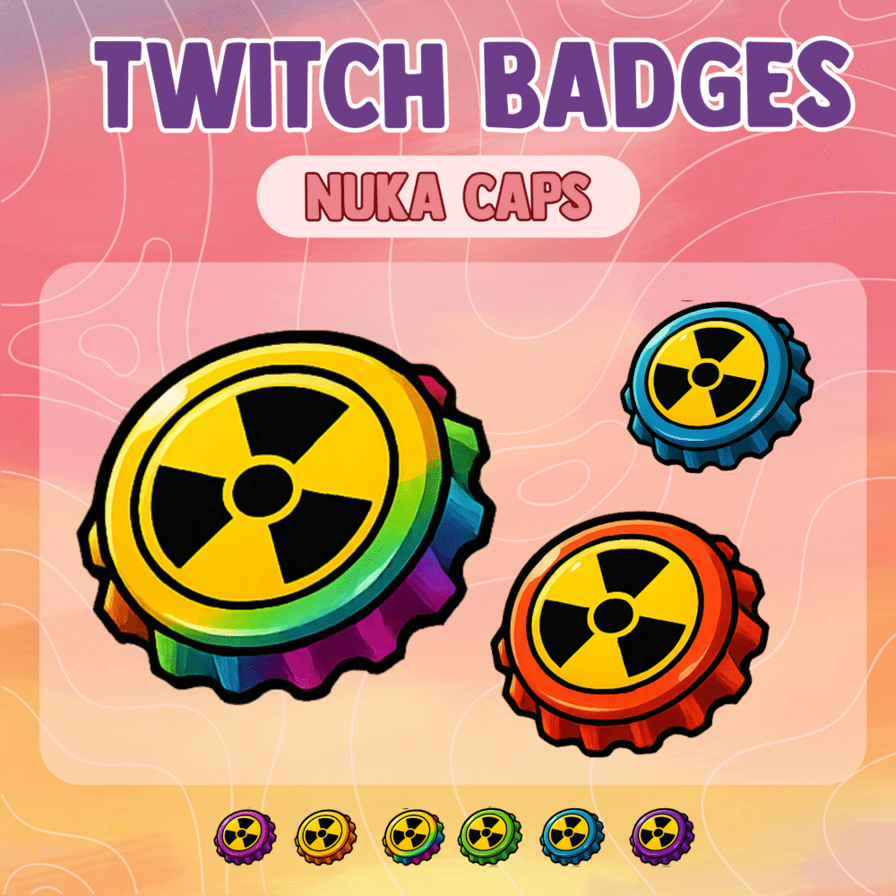 You can transform your channel with this full set of badges, and you can guide your viewers through a fun, exciting, and nostalgic progression system. Each badge carries the classic Nuka Cola look, and every upgrade feels satisfying. Since many viewers love Fallout, your subscribers enjoy every stage of their journey. Also, you create a stronger bond with your fans because the theme matches their favorite universe.